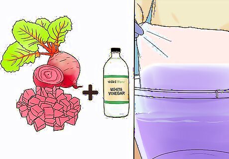 Mix chopped beets and vinegar if you want to make a lavender dye. Cut up 2-3 large beets into small, quarter-size chunks. Fill a large pop ¾ of the way full with water, and dump in your beets. Bring this to a boil, and simmer your beets for 1 hour on low heat. Then, turn off the heat and add ⁄2 c (120 mL) of vinegar. Slowly add your tablecloth to the pot until it is completely covered. Mix it up, and let the fabric soak for at least 2 hours.