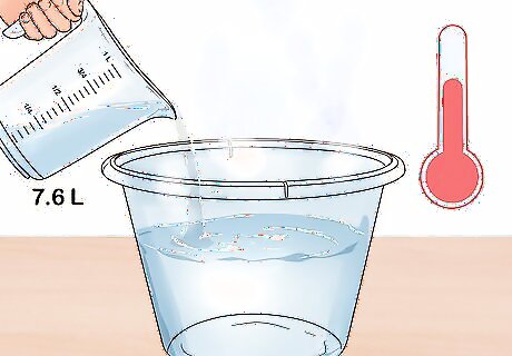 Fill a large bucket or bin with 2 US gal (7.6 L) of very hot water. Turn on your faucet and let the warm water run for a few minutes to heat up. Then, fill up your container with water. Warm water helps your dye adhere to the fabric. You want your water around 140 °F (60 °C).