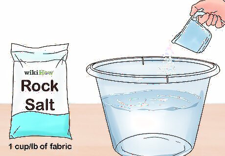 Add 1 cup (236.6 g) of salt for every pound of fabric used. The amount of salt you need depends on the thickness and weight of your particular material. Measure out your salt and pour it into your warm water, then mix it up using a spoon. The salt helps the dye penetrate the fabric and stay permanently. To find out how much your fabric weighs, read the packaging if it's a new tablecloth. If its an existing tablecloth, use an online fabric calculator based on your tablecloth's dimensions.