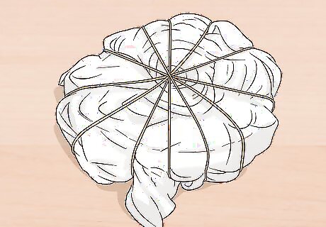Pinch the middle of the tablecloth and spin your fabric to create a spiral. With your index middle and thumb, secure the center of the fabric, and start twisting your hand clockwise. As you do this, use your other hand to guide the fabric. When you reach the end of the fabric, hold it with both of your hands to keep it tight. Then, wrap the ball of fabric with 3-4 rubber bands to create 6-8 even sections. This creates an all-over spiral pattern. If you are having trouble finding the center, fold the tablecloth in half lengthwise so it’s smaller and easier to work with.