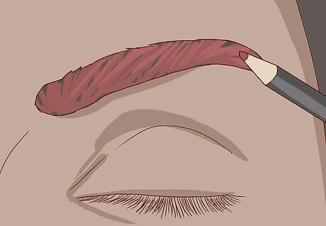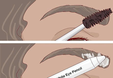 Color in your eyebrows using the pencil. Brush the hairs out first, so they're all aligned. Outline the eyebrow with the pencil, and then use small strokes to fill in the middle, following the direction of the hair. With the jumbo white pencil, you don't need to outline, as it's too big. Just run it over your eyebrow. You can also use an angled brush to apply it. If you used a brightly colored eye pencil, you don’t have to apply eyeshadow on top of it. Your color won't be quite as vibrant, but you'll still get an interesting effect.