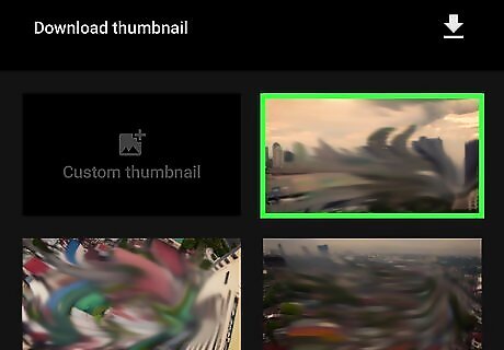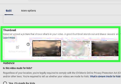 Select a thumbnail. Under the "Thumbnail" section, select a different still shot in the video to use as your thumbnail. If your account is verified and in good standing, you can choose instead to upload an image saved on your phone or tablet by tapping Custom thumbnail and selecting a photo. If you have not verified your account, tap Custom thumbnail and then tap Learn more. Tap on the blue text that says account is verified in the first paragraph and follow the instructions for verification. Go back to YouTube Studio and tap Custom thumbnail again.