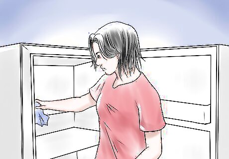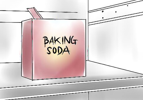 Place an opened box of baking soda in your refrigerator to remove smells from your refrigerator at a constant interval. The alkaline substance will help to neutralize acidic smells from fish, sticky spills and some leftovers. The box of baking soda should be replaced every 30 days, because the top of the baking soda can crust over as it absorbs moisture, limiting its absorption process. Alternatively, you can use a commercial freshening product.