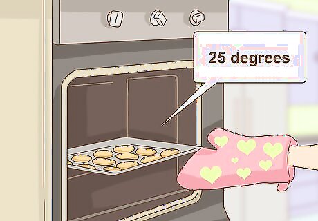 Lower baking times and temperature. Low-cholesterol recipes are often likely to bake faster than regular recipes because of the lower fat content. Try lowering the recommended temperature of the oven by 25 degrees, and start checking your dessert 5–10 minutes before it should be done baking. Check your baked goods for lightly browned edges or a springy texture to make sure they are done.