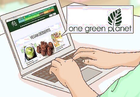 Download vegan-friendly apps. To help you stick to vegan dessert choices, download apps that support the lifestyle. Apps can provide vegan recipes, help you search for vegan-friendly businesses, or help you identify vegan products. Some good apps to start with include: Food Monster by One Green Planet, a free app for both Android and iPhone that provides over 500 free vegan recipes. Happy Cow, an app for both Android and iPhone that outlines vegetarian and vegan eateries, stores, or bakeries near you. Is It Vegan?, a free app that allows you to scan the UPC barcode on the package of any food or beverage product to see if it’s vegan.
