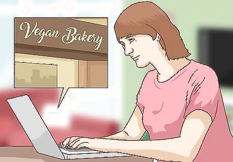 Visit a vegan bakery. To really indulge in cholesterol-friendly, vegan desserts, visit a vegan bakery to buy a plant-based treat. Vegan-friendly diet choices are rising in popularity, and with more people aiming to move away from meat and milk ingredients, vegan businesses are on the rise as a result. To find a vegan bakery near you, visit VegGuide.org, a community-based website listing veg-friendly eateries around the world.