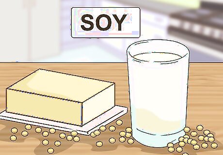 Include soy-based products in your baking. Soy protein is a good alternative for many foods that are high in animal fats. Whenever possible, use soy as a substitute for its cholesterol-heavy counterparts in dessert recipes. For instance: Substitute soy nut butter for butter Use soy milk instead of regular milk Use soy cheese in place of regular cheese.