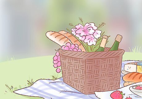 Go on a picnic with friends or family. Invite your friends or family to go on a picnic with you to a nature preserve, park, or even your own backyard. You can have everyone bring their own dish to share, and make sure you bring a blanket to sit on. If it’s a hot day outside, find a shaded picnic spot under a tree and bring lots of water or other drinks to share.