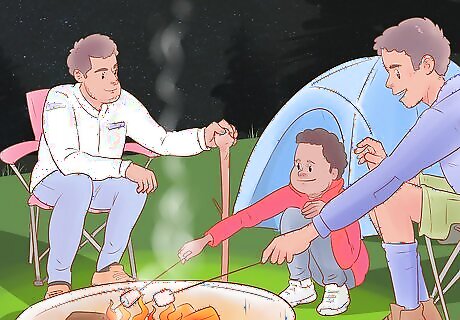 Camp out with friends or family. Invite a bunch of friends to go camping or ask your family if they’d like to go. You can camp out in the woods, in a park, on a beach, or even in your own backyard. Bring a tent and enough sleeping bags for everyone, and prepare food to eat while you’re out in nature. If you’re camping in a public place, check to make sure you don’t need permission before staying there. Check the weather beforehand to make sure it’s not going to rain. You can bring s’mores to roast on a fire, a frisbee to toss with friends, or cards to play in your tent.