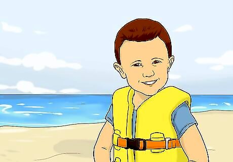 Have your toddlers wear a life jacket in the waves. Even if you’ll only be in shallow water, put approved safety flotation devices on your children. The safest option is a well-fitting life jacket that is approved for your child’s weight. If you have a child who resists wearing a life vest, consider buying one in a bright, fun color or that has a favorite cartoon character on it so your child will feel more excited. Avoid water wings, as these can slip off of children’s arms and leave them vulnerable.