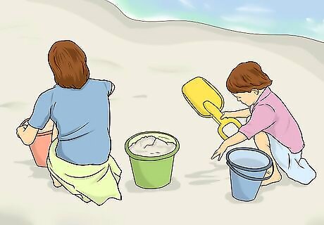 Have a relay race. Place two large buckets in the sand, then have children fill up smaller buckets with water and race to see who can fill up their big bucket the fastest. This can work for as few as two children, but it’s also great for groups big enough to divide into teams!