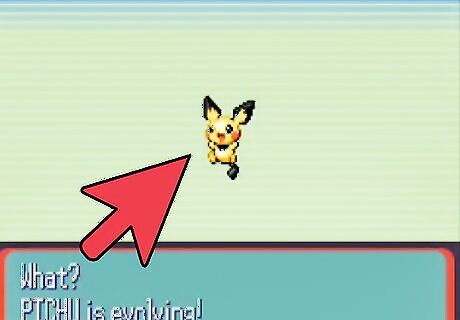 Battle with the Pokémon. A Pokémon's happiness will be increased when it levels up in battle. However, if it faints, happiness will be decreased by 1, so be sure to heal it or switch it out when at low health.