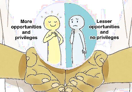 Talk about fairness to help kids understand racism. School-aged kids have a keen awareness of when something feels fair or unfair. Describe racism as an essentially unfair system that helps one group have power over others because of their race. Activities can help to demonstrate inequality. If you have a group of kids, hand out a treat (a piece of candy, stickers, a quarter, etc.) Give some kids more than others. For those who have less, ask them how it feels. For those who have more, ask them how it feels to have more. They will also probably say it feels unfair. Explain to them that this feeling of unfairness is called privilege. Explain to them that the feelings people have about racism are important to be aware of, and it's also important to work together to make everything fairer.
