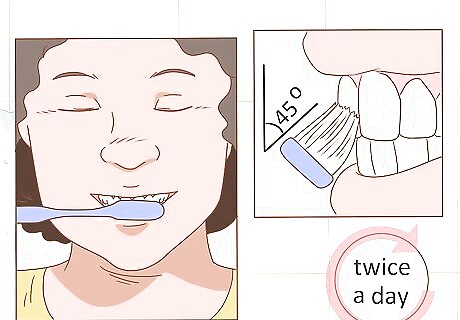 Brush your teeth twice a day. Brushing your teeth daily is an important way to prevent cavities and infections.t You should brush your teeth in the morning and at night. To brush, hold your toothbrush at a 45-degree angle to your tooth, and make small back-and-forth motions followed by vertical movements to brush the gums on your tooth surface so you can prevent and stop gum recession. Move the brush around the front, back, and bottom of your teeth. Don’t forget to reach back into your mouth. Perform circular motions on the chewing surfaces of your teeth. Keep brushing for at least two minutes. Use a fluoride toothpaste and a brush with medium to soft bristles. You should brush your tongue as well as your teeth to reduce bacteria in your mouth. Replace your toothbrush every three to four months to prevent the build-up of bacteria.