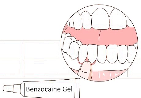 Rub on some topical antiseptic gel. Benzocaine gel can help reduce pain in toothaches and other painful mouth conditions. Put a small drop on your finger or on a cotton ball. Gently apply to the affected tooth or area. Follow the dosage information on the box very carefully. Use the smallest amount necessary to cover the affected area. Keep it on for about 10 to 15 minutes and avoid swallowing during the procedure. If the gum turns red or it starts to burn, then remove the gel right away and rinse. You can buy benzocaine over the counter at pharmacies or drug stores. Do not eat within an hour of using benzocaine in your mouth. If you develop a headache, fatigue, confusion, fast heart rate, shortness of breath, or a gray/blue color in your skin, lips, and nails, seek medical attention immediately. You may have a rare side effect called Methemoglobinemia.