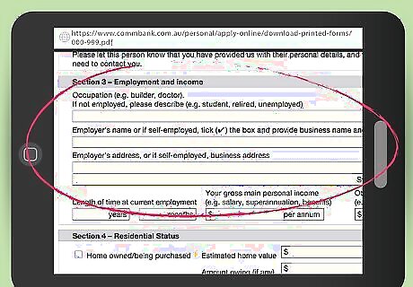 Give your employment history. If you are currently unemployed, your application will probably not be approved. A solid employment history demonstrates that you are responsible and have the ability to make payments. The longer you have been at the same job, the better. The application will ask for the: Name of your employer Your position Length of employment - Start date and end date. The type of business - Education, financial, food service, etc. Address and phone number of business You may have to provide information for your last few employers