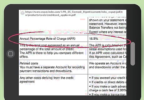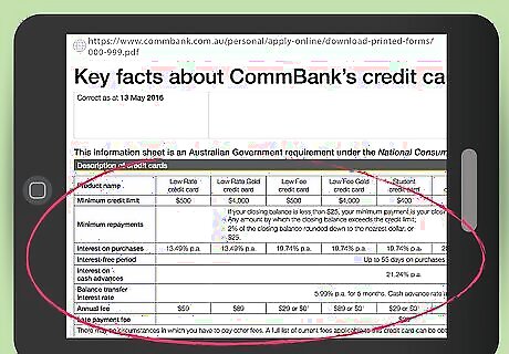 Shop around for a card. Once you have determined the type of card you need, shop around to find the best deal. Start looking at your current bank or credit union. You may be able to get a better deal because you are an existing customer. Take your search online after that. Check each credit card for the following things: APR APR for balance transfers Penalty APR (How much? How long does it last? What initiates it?) Fees (e.g. annual fee, cash advance fee, late-payment fee, and balance transfer fee)