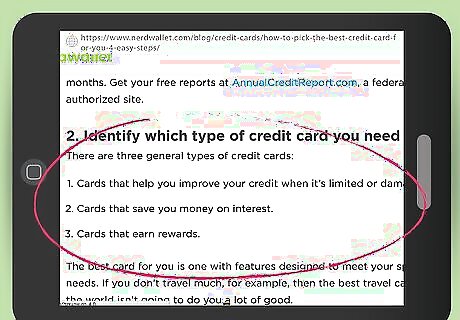 Determine your needs. There are 3 major types of credit cards. They are cards that help you build or repair your credit, cards that save money on interest, and cards that offer you rewards. The best card for you depends on your current needs. If you are trying to build your credit, you do not need to apply for a card that offers cashback or travel rewards. Apply for a secured card or a student credit card (if it applies to you). To save money on interest, look for a low interest, 0% APR, or a balance transfer card. If you plan to pay off your balance in full every month, you may want a rewards card. These cards have a higher APR rate, but have many benefits.