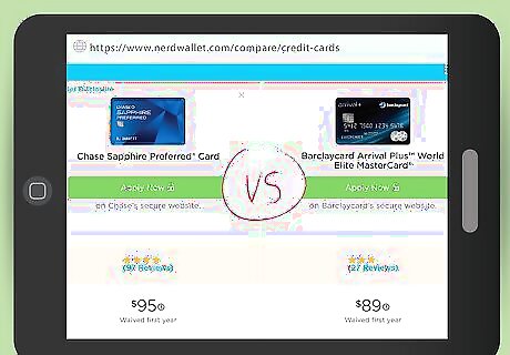 Compare your final choices. You may find two or three cards that meet your needs. Examine each card for differences. Nerdwallet has a tool that lets you do side-by-side comparisons of different cards. Things that you should look depend on the type of card you have: For low-interest cards look for late fees, the change in the APR after initial period, and the length of the APR period. For secured and credit cards look for credit limit increases for making timely payments. If you are using a balance rewards card look for an expiration date to use your rewards.