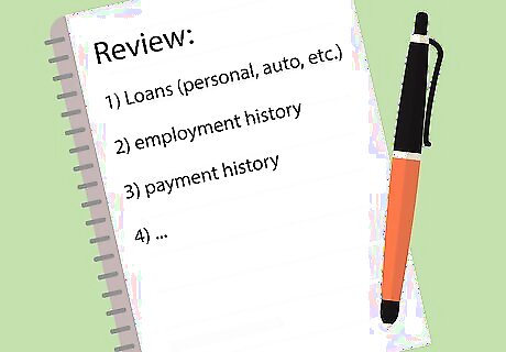 Make sure your finances are in order. Review your credit card debt and loans (e.g. personal, school, auto, etc.) before you apply. Also think about your work history and payment history. If you identify an area that needs improvement, work on that before you apply. Avoid taking any cash advances or going over your credit limit when you seeking to apply. Establish a history of timely payments for all of your debt.