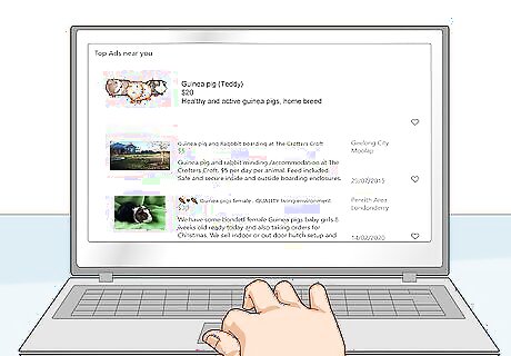 Locate local pin boards. Create a flyer of your guinea pig, including their name, breed, sex, and your contact details. You will need to add at least your phone number and a price of your guinea pig. Pin boards can be found in places such as a small shopping complex, community centres, grocery stores, libraries and coffee shops.