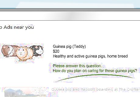 Write up a screening questionnaire or adoption contract. This is to keep impulse buyers away or anyone who may potentially neglect your pet. Ensure the potential buyer is knowledgeable of guinea pig care and is happy to take them to a vet when needed. Screen potential adopters. Ask them basic questions about guinea pig care to define whether they are suitable pet owners.