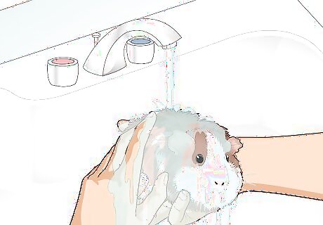 Clean your guinea pig. Give them a short bath and gently clean any dirt from around their eyes or ears. Be mindful that guinea pigs are sensitive and do not need regular cleaning. Use a pet-friendly shampoo that is marketed for small animals. Do not use dish soap, human, or cat/dog shampoo. The soap is too rough on their skin and may cause dry flakiness.