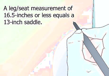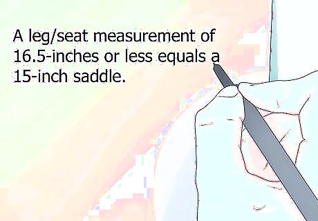 Find your size in an English saddle. Use your seat measurement to determine the seat size (and therefore the saddle size) of an English saddle. The measurement/size approximately equates as: A leg/seat measurement of 16.5 inches (41.9 cm) or less equals a 15 in (38 cm) saddle. A leg/seat measurement of 16.5 to 18.5 inches (41.9 to 47.0 cm) equals a 16 in (41 cm) saddle. A leg/seat measurement of 18.5 to 20 inches (47.0 to 50.8 cm) equals a 16.5 in (42 cm) saddle. A leg/seat measurement of 20 to 21.5 inches (50.8 to 54.6 cm) equals a 17 in (43 cm) saddle. A leg/seat measurement of 21.5 to 23 inches (54.6 to 58.4 cm) equals a 17.5 in (44 cm) saddle. A leg/seat measurement larger than 23 inches (58.4 cm) will fit an 18 to 19 in (46 to 48 cm) saddle.