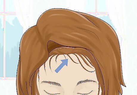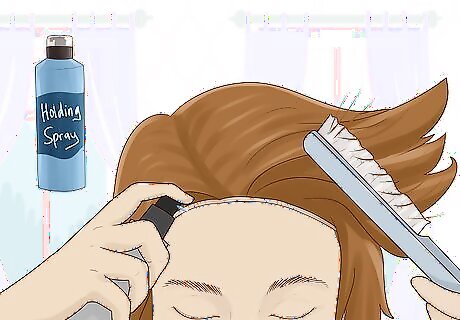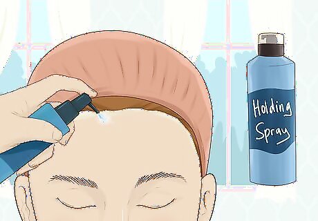 Spritz on a bit of holding spray where the wig meets your hairline. Take the scarf off if you put one on. Spray on a bit of the product right at the part, catching the front of the closure and your edges. Also, if you have hair hanging down in front of any part of the wig on your forehead, lift it up and spray a bit along the closure there, too. Make sure to pick a product that dries clear. The holding spray will keep your closure from moving back and forth on your head.