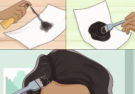 Comb in temporary hair dye for a more permanent fix. Find a can of temporary spray hair dye that matches the hair color of the wig. Spray it onto a spoolie (clean mascara brush) over a piece of newspaper. Comb the color into your part, starting at the middle and working your way out. Comb out both sides of the part. The dye should help color in the balding spot. You can also try this with colored hair pomade.