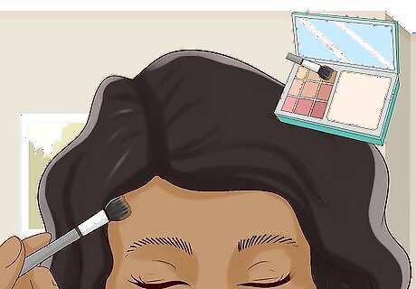 Try brushing eye shadow into your part for a quick fix. Pick a color or mixture of colors that match your hair color. Dab a small flat brush into the eye shadow, then brush it along the part with the wig on your head. Brush it into the scalp and then move the brush with the grain of the hair, brushing out away from the part on either side. Keep filling it in until the whiteness of the bald spot is gone. Work it into the roots nearby by swirling the brush around. That way, it blends in with the wig. Comb the part into place when you're done. If you can take the wig off, you may need to apply some underneath the bald spot, too.