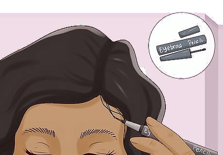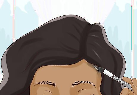 Color in the closure with an eyebrow pencil in the same color as the dye or eye shadow. Draw along the edge of the part, moving out towards the hair as you do. Try to fill in most of the balding spots with the eyebrow pencil, but leave a line along the middle for the part. Part of the issue with a thinning wig is the closure shows through. If you color it in, the wig won't look as thin.