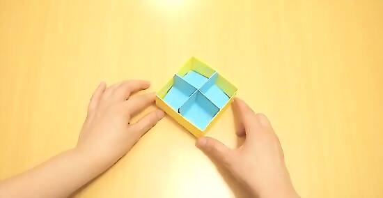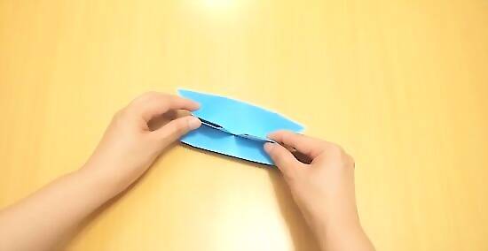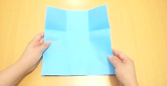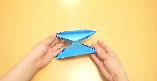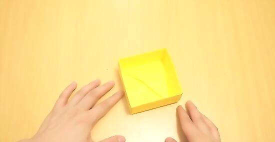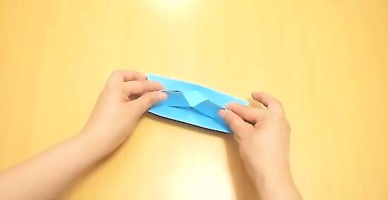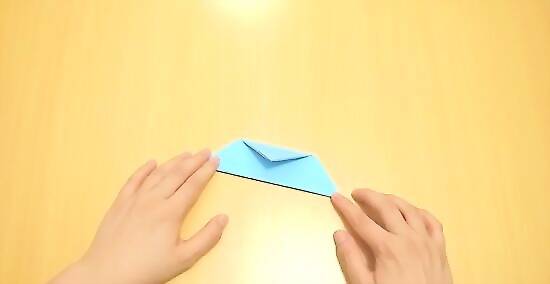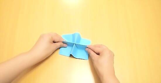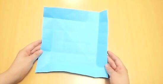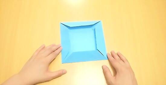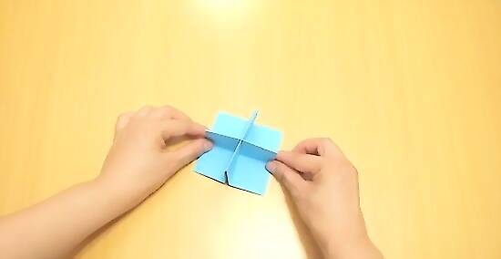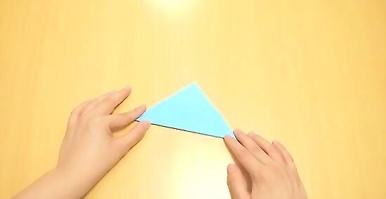 Pick the paper up and fold the diagonal fold lines outwards and horizontal fold lines inwards. This forms a double-layered triangle, known as the waterbomb-base.