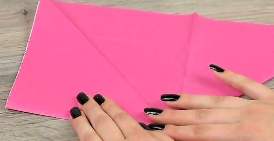 Fold the napkin in half diagonally to form a triangle. Rotate the napkin on the table so it looks like a large diamond. At this point, take the top and bottom corners of the diamond and bring them together, forming a large isosceles triangle. Smooth out the crease along the bottom of the triangle so the napkin better holds its shape. Try and line up the edges as best as you possibly can. If the napkin edges look uneven, then the flower will look uneven as well.