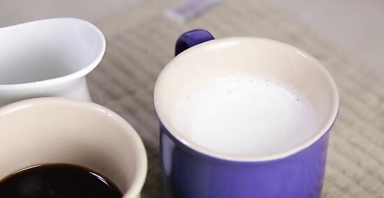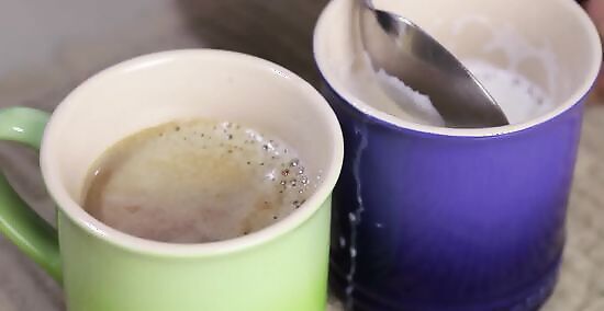 Use a spoon to hold back the foam. When adding the milk to the coffee, you should use a spoon to hold back the foam until the cup is 2/3 full. Then use the spoon to scoop the foam on top of the milky coffee.