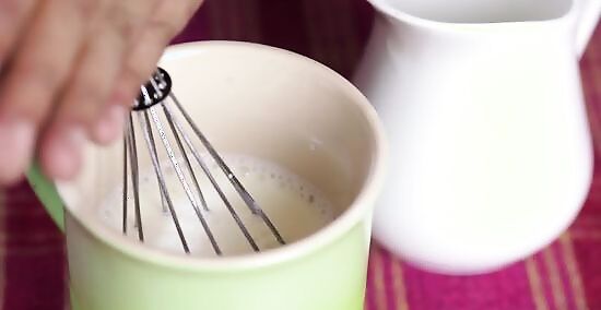 Use the wire whisk to create foam. Once the milk is heated, place the wire whisk into the milk and twirl the handle between your palms to create foam. Keep twirling the whisk until you achieve the desired amount of foam.