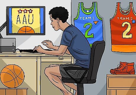 Join an Amateur Athletic Union team in your area. The Amateur Athletic Union promotes amateur sports in the United States. While playing on your high school team is vital for getting a scholarship, you can increase your chances by joining a team outside of school as well. Not only will you be playing more basketball, you'll also be able to develop your game by playing with different players. Playing for more than one team will show college recruiters that you are dedicated, driven, and have a passion for the sport. The AAU breaks their teams down into age groups. It has 17-and-under and 15-and-under teams. Tournaments that are sponsored by the AAU are sometimes called high-profile recruiting camps because collegiate basketball programs rely on the tournaments to scout the best players in a central location. You can find the Amateur Athletic Union website here: http://aausports.org/.