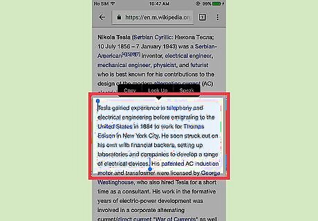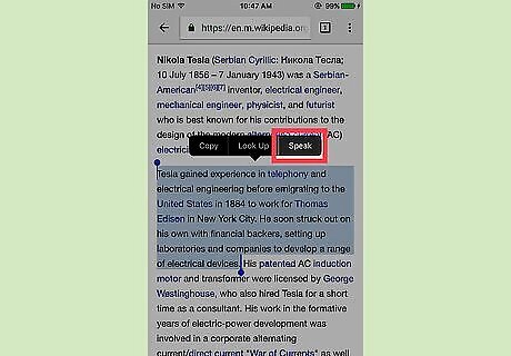 Tap Speak. It’s next to “Copy” in the bar above the selected text. Your iPhone will now read your selection aloud. Tap Pause at any time to pause the audio. Move the blue cursors to include more (or fewer) words in your selection.