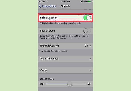 Slide the “Speak Selection” switch to the on position. This screen is also where you can change the rate at which text is read aloud. Move the slider under “Speaking Rate” to the left to decrease speed, or right to increase.