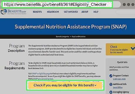 Complete the application for food assistance. Food assistance, also known as "food stamps" or SNAP (Supplemental Nutrition Assistance Program), is a federal program administered by state welfare agencies. You typically can apply online, over the phone, or in person at a county welfare office. To find the right website for your state agency, do an internet search for "SNAP" or "food stamps" followed by the name of your state. Check the addresses that come up. The official website typically will end in ".gov." The website will have an online application as well as information on other ways you can apply. If you want to apply in person, look for a locator map to find the office in your county.