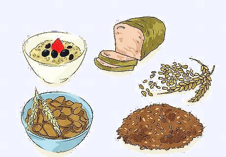 Eat foods rich in whole grains. Half of the carbohydrates you eat should be whole grain so you get dietary fiber, iron, and B vitamins. Make simple swaps like eating whole-grain bread instead of white bread, brown rice instead of white rice, and oatmeal instead of breakfast cereal. These foods will keep you fuller for longer and can help keep your cholesterol low. You can usually find whole-grain versions of pancakes, tortillas, pasta, bread, and bagels.