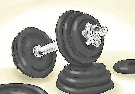 Invest in free weights or kettlebells to increase resistance. You can easily pick up some free weights like dumbbells or kettlebells at thrift stores or online. Get some in a variety of weights so you can challenge yourself as you work out. Resistance bands are another great tool to get more out of your workout. Don't want to buy equipment? Check your home for things you can lift. You might pick up heavy cans while strength training or use a sturdy scarf instead of an elastic resistance band.