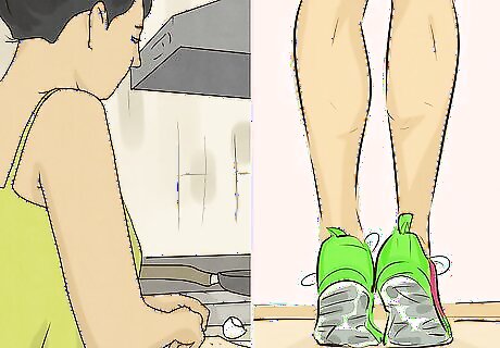 Do a stretch while you're completing a chore. Think about all the times you're doing something around your home where you're just standing in place. Maybe you're standing in front of the mirror brushing your teeth, standing in front of the stove while cooking, or standing while you fold clothes. Come up with stretches you can do while you work on those tasks so you're getting your chores done, but exercising at the same time. For instance, do a few squats while you brush your teeth or do calf raises while you're cooking.