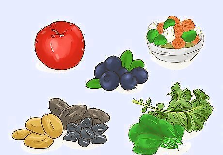 Aim for 5 servings of fruits and vegetables every day. Fresh produce contains lots of vitamins and minerals so try to eat variety. If you find it hard to add fruits and vegetables, try gradually including them in your meals. For instance, eat 1 serving at breakfast, 2 servings at lunch, and 3 at dinner to get all of your recommended produce. Not sure what a serving is? Here are a few examples to get you started: 1 small apple 1 cup (190 g) of berries 1/2 cup (82 g) of dried fruit 2 cups (200 g) of leafy greens 1 cup (90 g) of raw or cooked vegetables like broccoli or carrots