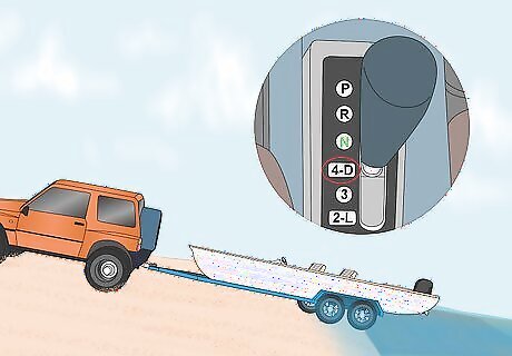 Put the vehicle in drive and give it gas to get up the hill. If 4WD isn't enough, load as much as you can into the back of the vehicle for more traction and get as much weight out of the boat as you can so it will be easier to pull out.