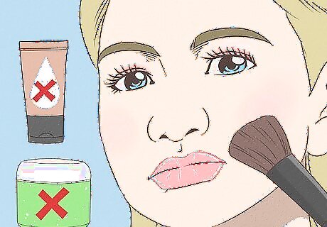 Avoid makeup and hair gels that might worsen the condition. Thick makeup and hair gel can cause your acne to get worse. As your skin and hair naturally secrete oil throughout the day, residue from makeup and gel can get moved across your skin and clog your pores. Use only a light layer of makeup or consider going natural during some days. Always wash your makeup before bedtime (see last section). Choose makeup that is oil-free and noncomedogenic. Water-based or mineral-based makeup is usually a good choice.