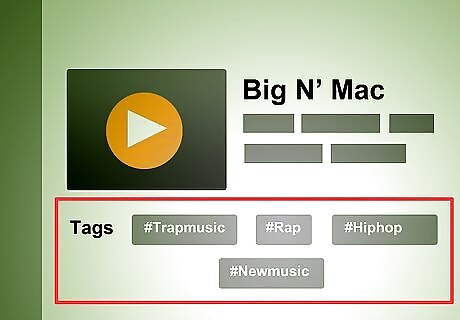 Tag your music to make it easier to find. Stick with popular tags for the genre of music you’re creating. Be as honest and accurate as possible. You can tag your tracks under the “Basic Info” tab under the track description. Tags will help new people find your music. For example, if you produced drum & bass music, you could use the tags #house, #winter, #low-fi, and #118bpm. If you are a rapper who makes trap music, you can use the hashtags #trapmusic, #rap, #hiphop, and #NewMusic.