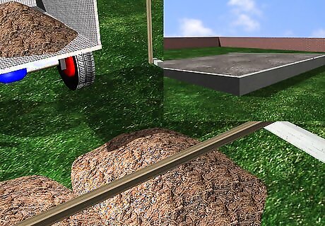 Move the loose dirt over to the low side. Shovel the dirt into a wheelbarrow and dump and tamp it using a hand tamper ($20). If you're simply trying to build the grade on the low side, not much tamping is necessary. A good heavy rain will settle your fill. Final tamping will be done after the grade is level and raked out.