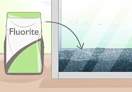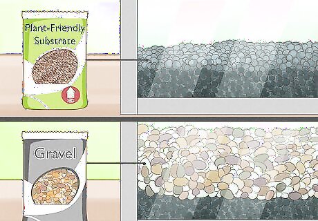Add a plant-friendly substrate to the tank and cover it with gravel. Your substrate is the material you use to cover the bottom of the tank. When you’re growing plants, you need a nutrient-rich substrate, which can initially be a bit more expensive. The substrates that are good for planting also tend to cloud the water when they’re disturbed, but you can stop this by applying a thin layer of gravel over it. Seachem Flourite contains all of the necessary nutrients and comes in a variety of colors. Clays and laterite are good options for nutrients and can be less expensive. However, they often take more time to settle in the tank. Aqua Soil has good nutrients for plants but drops the pH of the water to 7. While this is optimal for plants, it can harm some fish. Check the pH requirements of your fish before choosing this substrate. Gravel alone will not nourish your plants.