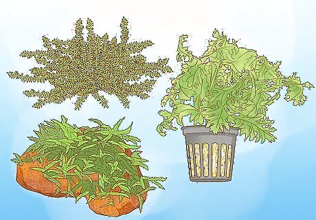 Use mosses to decorate along the bottom and front of the tank. Easy to grow freshwater mosses include Java Moss, Willow Moss, and Water Wisteria. Moss is a low-growing plant, so you can put it in the front of your tank without obscuring other plants. It also helps keep your tank clean. Moss grows quickly, so you will see fast results with this plant. Moss grows best with medium to bright light. Mosses are often edible for fish. You will still need to feed your fish, however. Not all fish will eat the moss. Another great option for the bottom and forefront of your tank is a plant called dwarf baby tears. This lush, leafy plant grows quickly like moss but it has a more shrub-like appearance. This plant grows best in bright light.